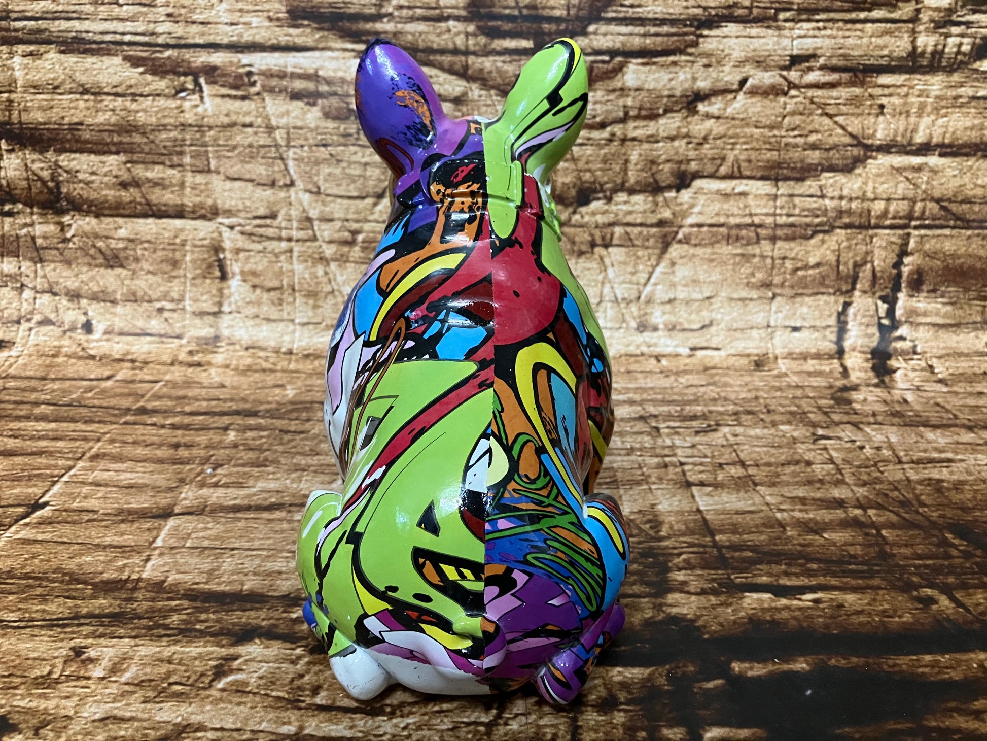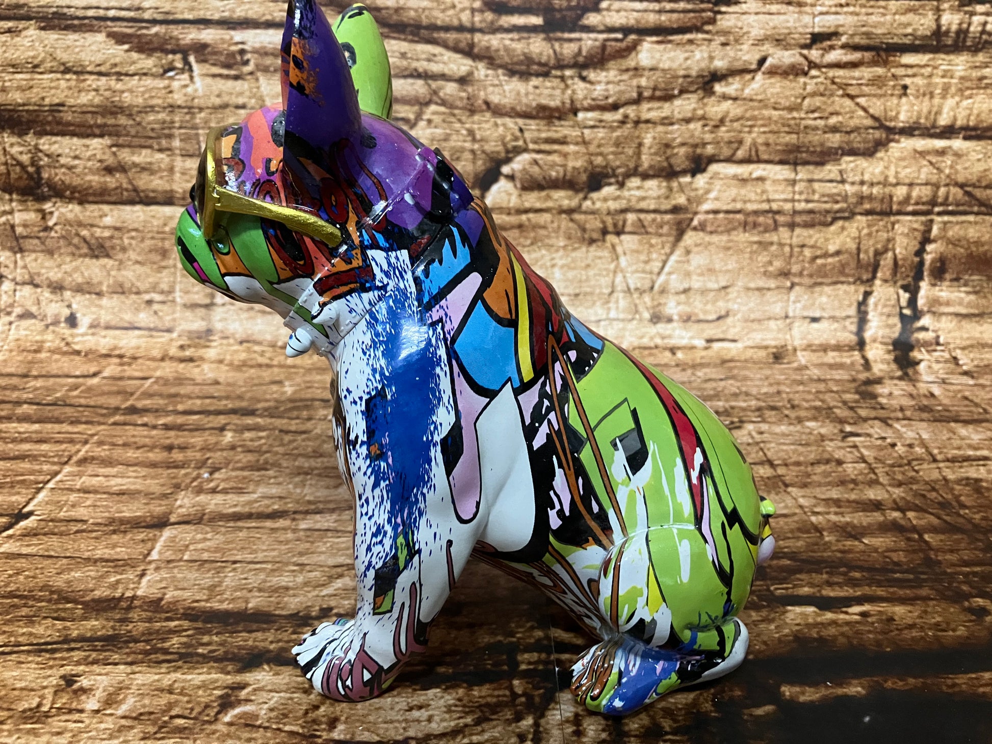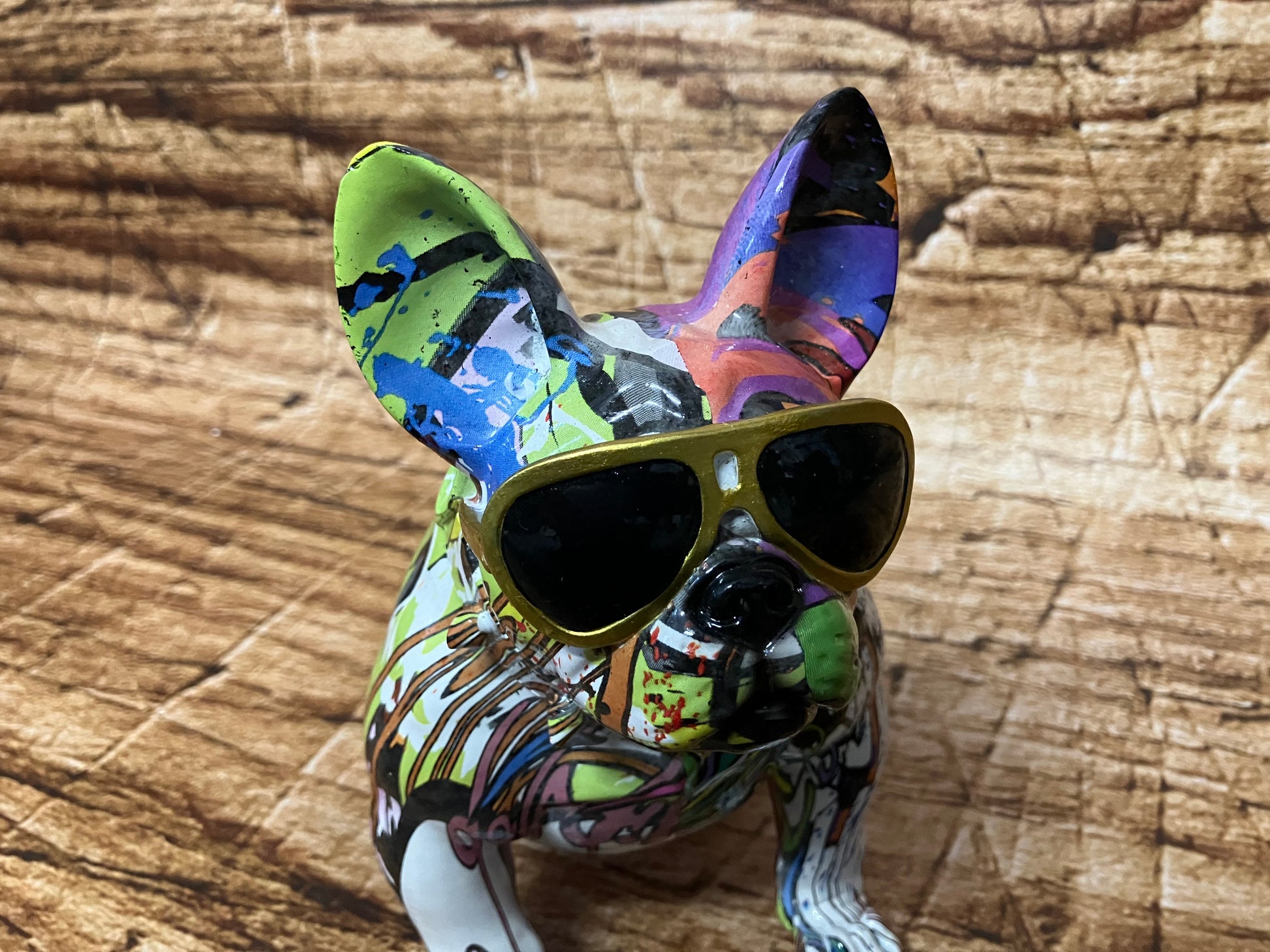 Een stoer kleurrijk beeldje van polyester van een bulldog met zonnebril.