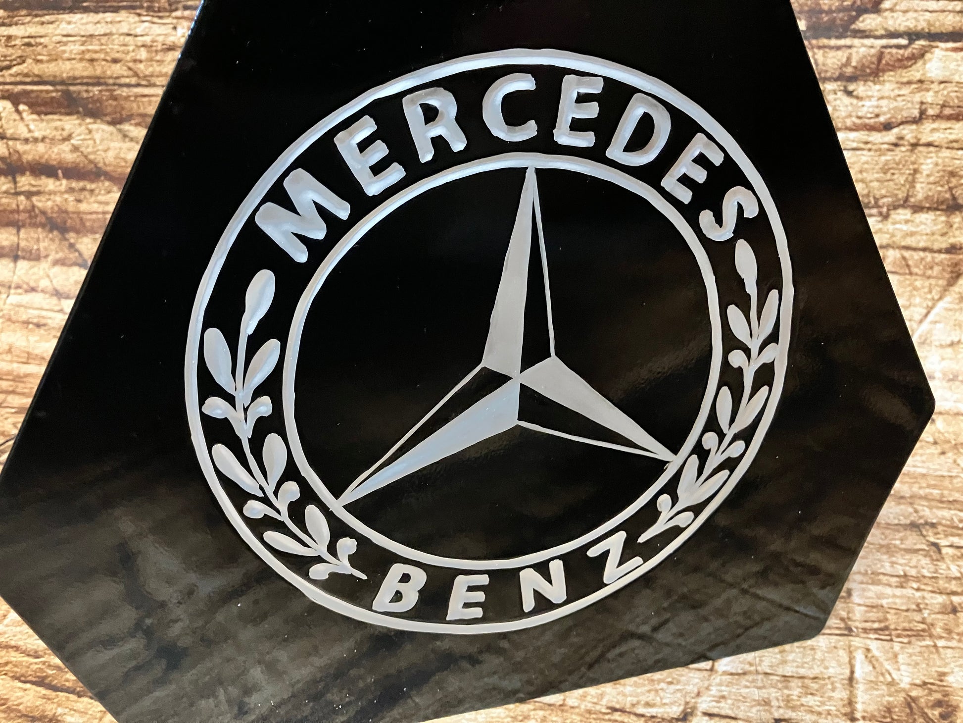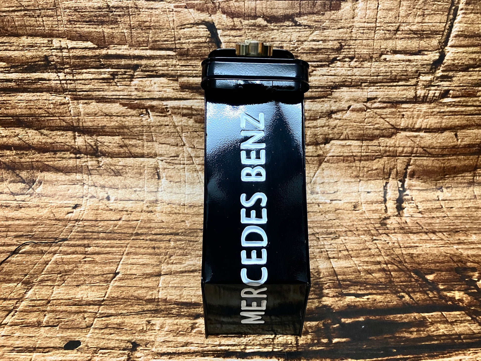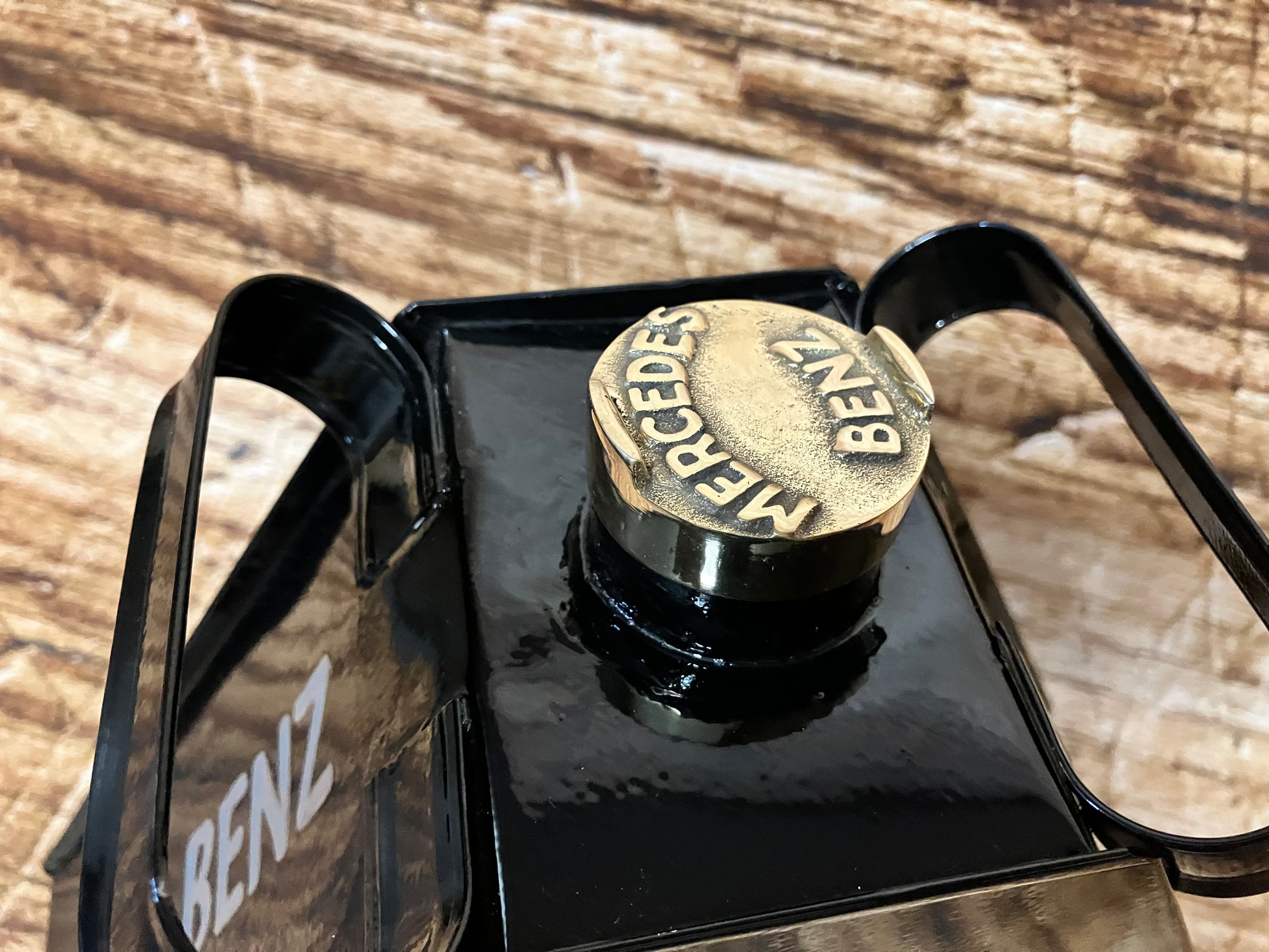 Jerrycan metaal handgeschilderd met Mercedes-Benz logo en messing dop.