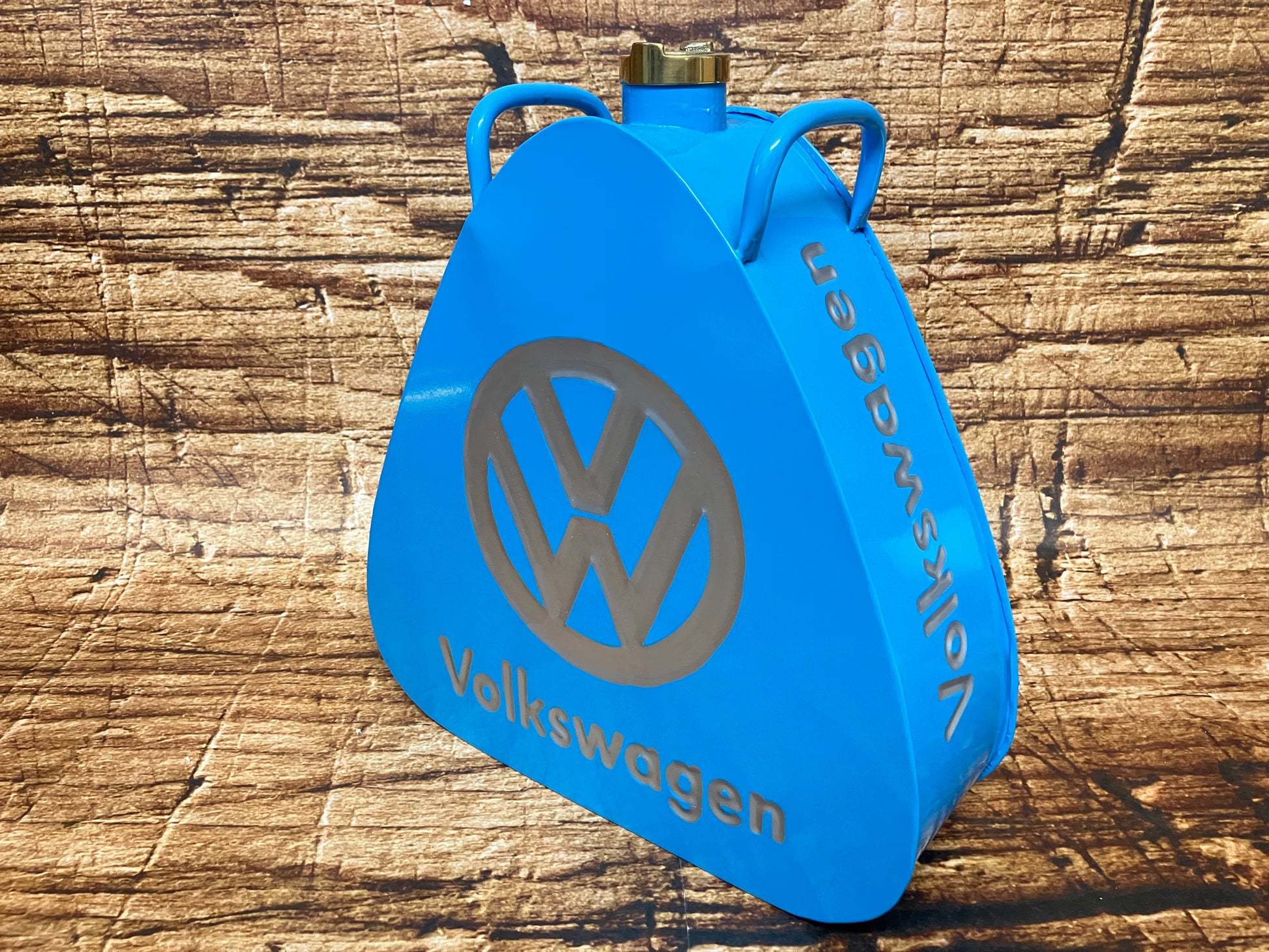 Jerrycan metaal handgeschilderd met VW (Volkswagen) logo en messing dop.