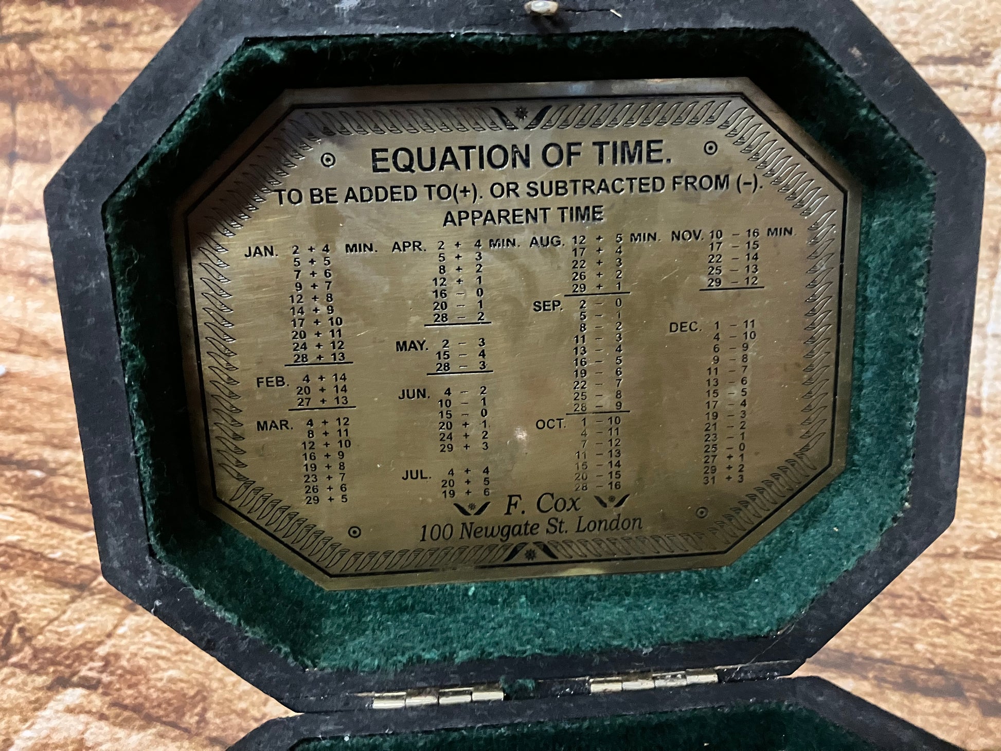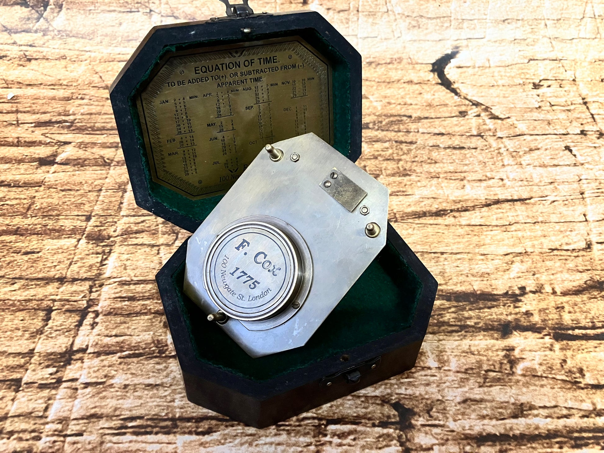 Een replica sundial en kompas F. Cox 100 Newgate St. London.