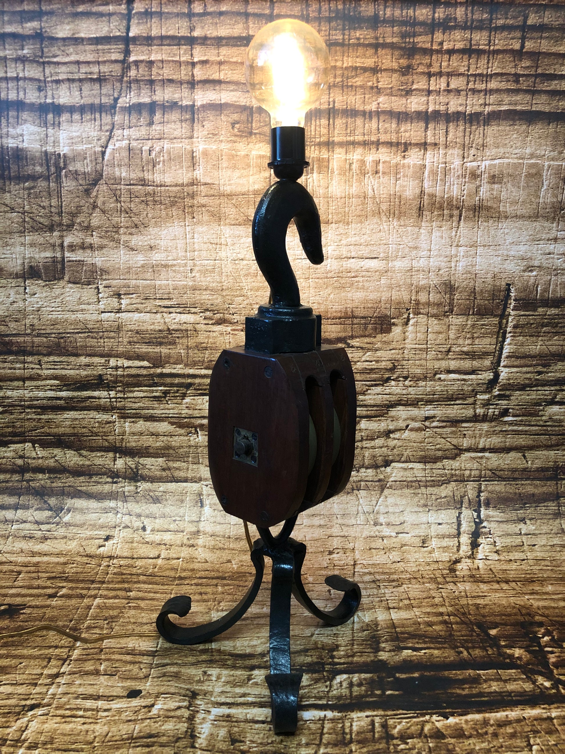 Een antieke katrol vermaakt naar tafellamp.