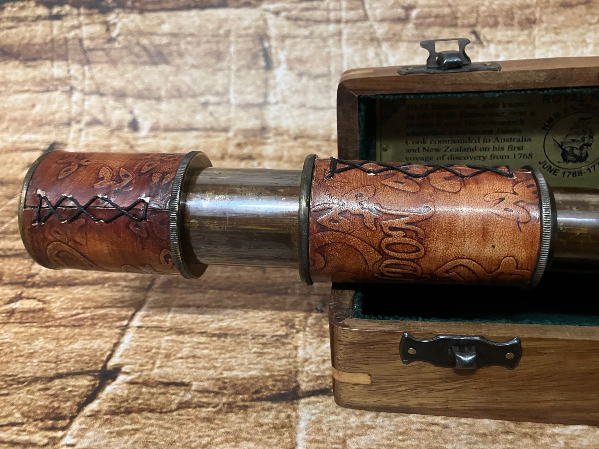 De Telescoop is volledig van messing en glas bekleed met leer.