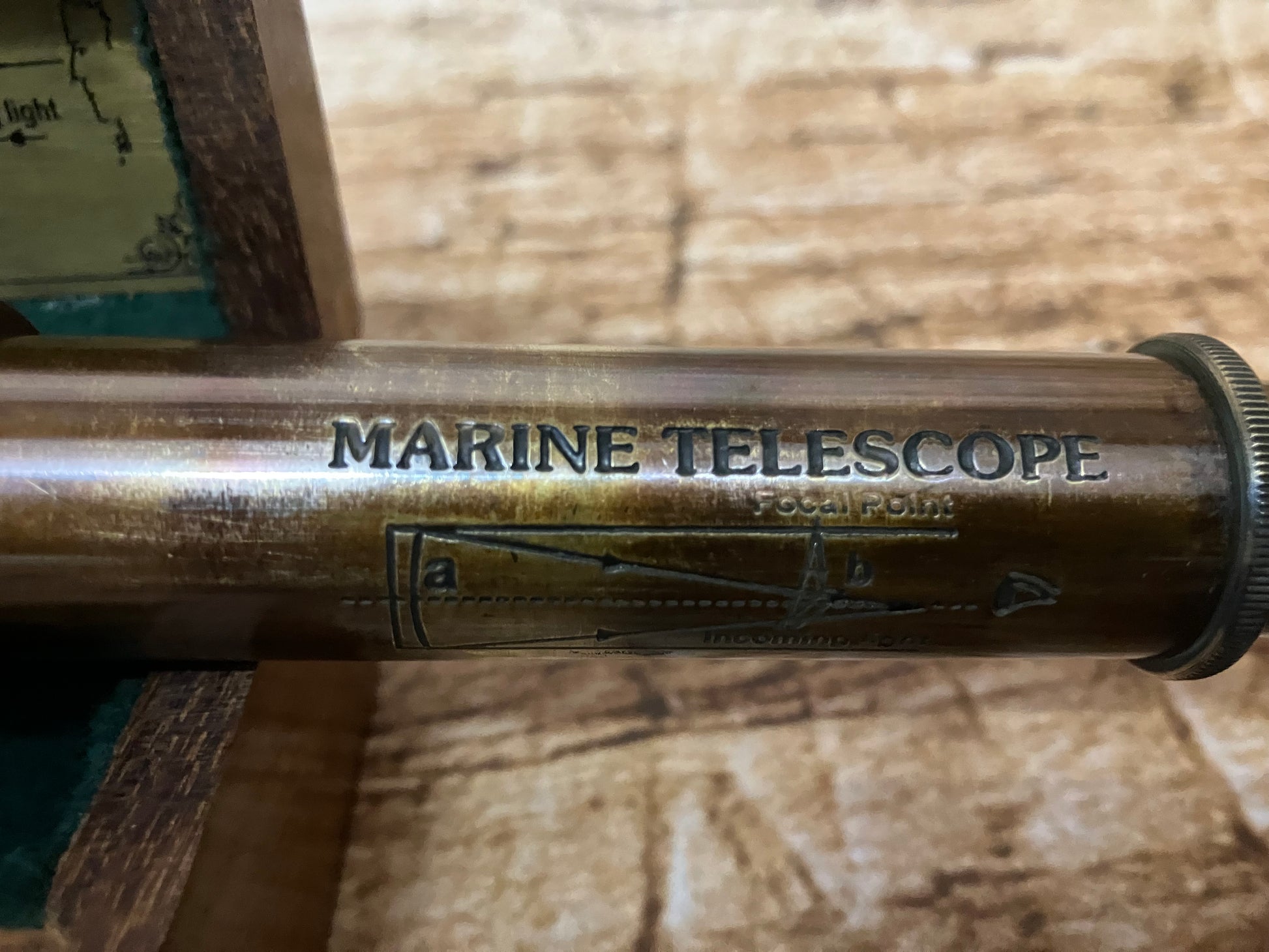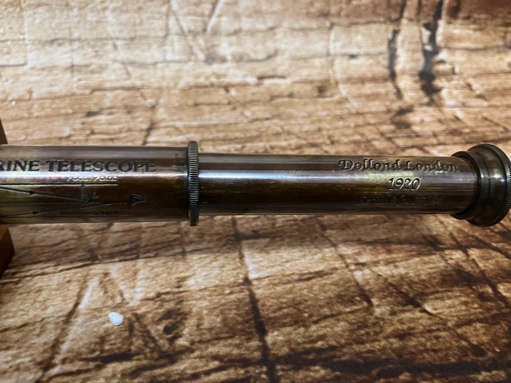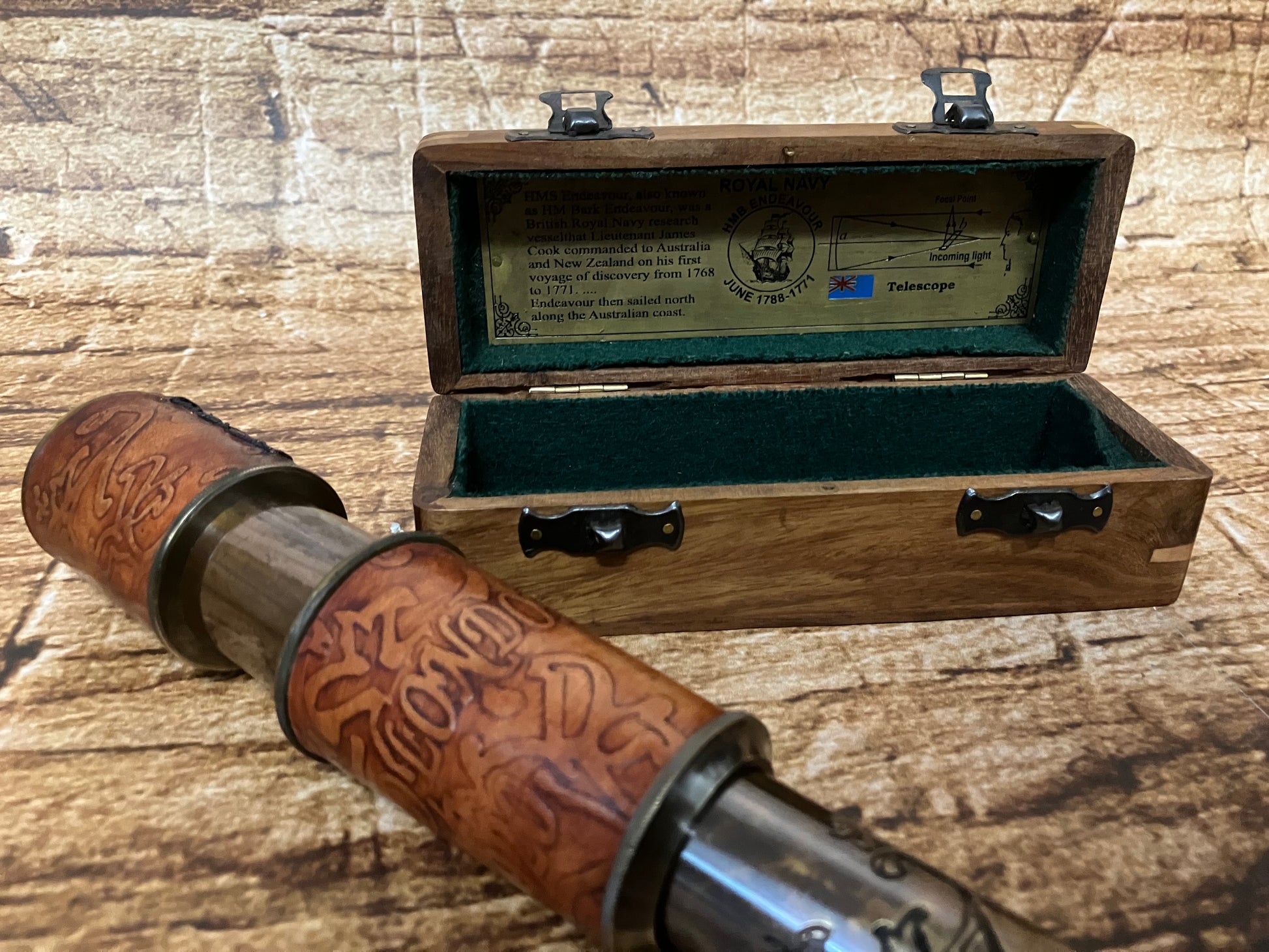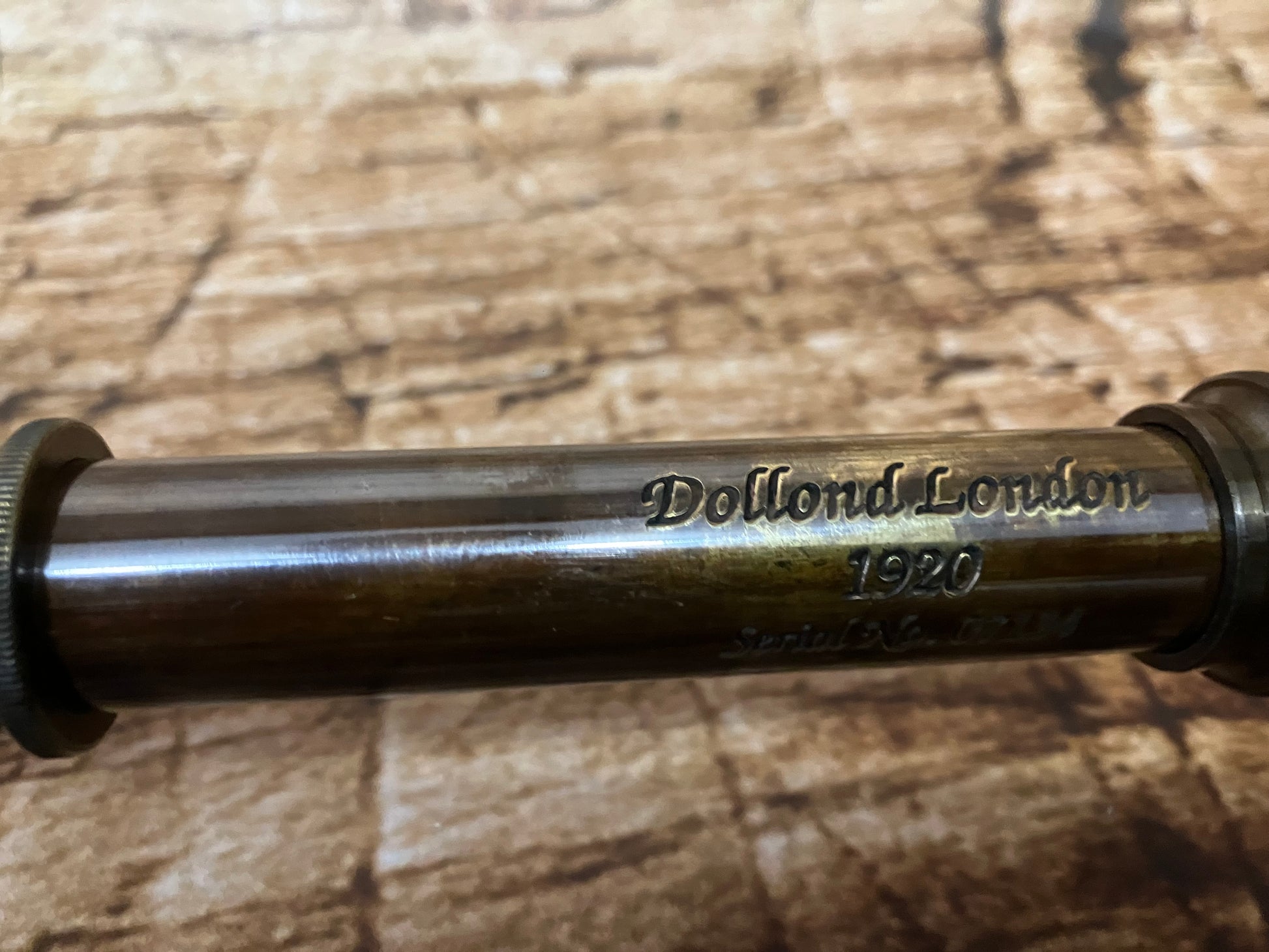 Een replica Telescoop Dollond London 1920 in opbergkistje.